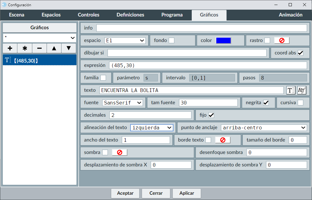 Pasamos a introducir el título del juego "ENCUENTRA LA BOLITA" mediante un texto (que se introduce desde el menú gráficos, botón + y añadimos el texto) en color azul, negrita, del tamaño que deseemos centrado en la parte superior, alineado al centro. Finalmente pulsamos el botón Aplicar.
