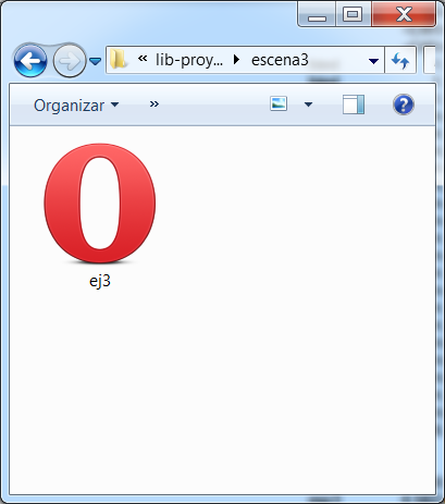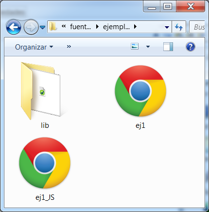 La primera consiste en que el archivo intérprete descartes-min.js acompañe al fichero de la escena, para ello hay tres opciones; portable, de proyecto y personalizada del menú opciones del editor de Descartes. En la opción de proyecto, el intérprete descartes-min.js se coloca una carpeta llamada lib. Esto lo colocar automáticamente el editor de Descartes. En la siguiente imagen vemos las páginas web ej1 y ej1_JS que contienen escenas y la carpeta lib que contiene el fichero descartes-min.js (todas las páginas con escenas que estén junto a la carpeta lib serán interpretadas por el fichero descartes-min.js que se encuentra en ella). Por ello, cuando las escenas se guarden con la opción portable, la carpeta lib que contiene el fichero descartes-min-js, deberá acompañar a las escenas guardadas con esta opción.