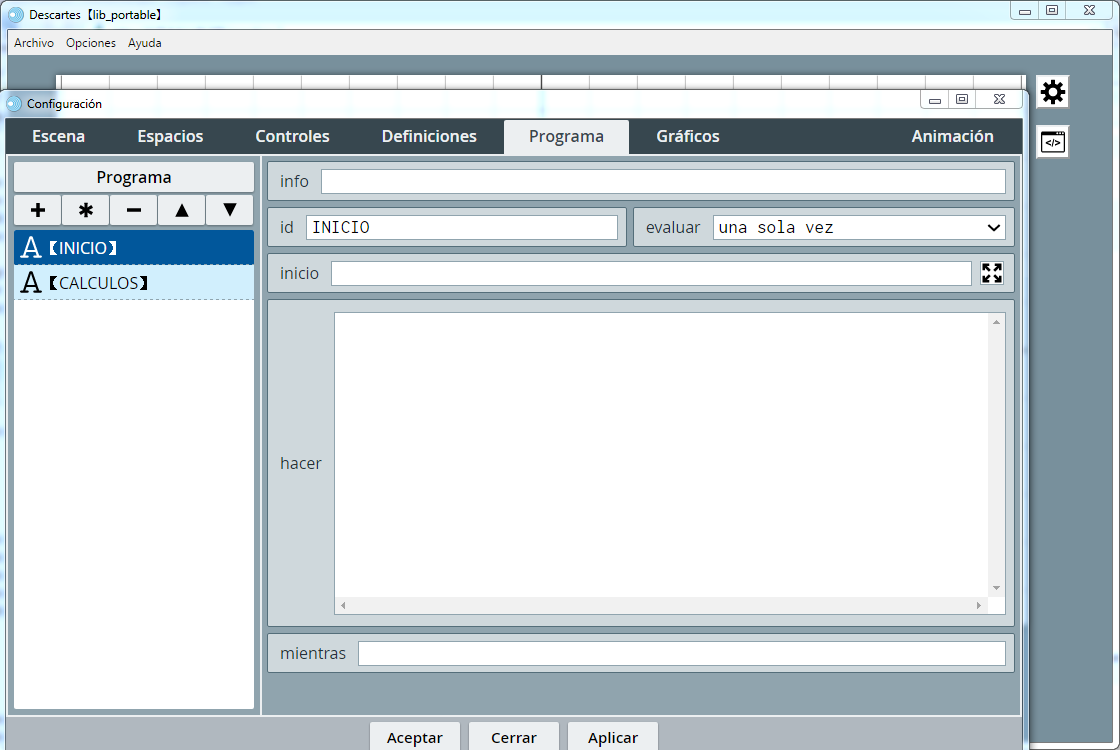 Pulsando en el icono de la rueda dentada del editor de Descartes, se abre el editor de escenas, tal y como se comentó anteriormente.