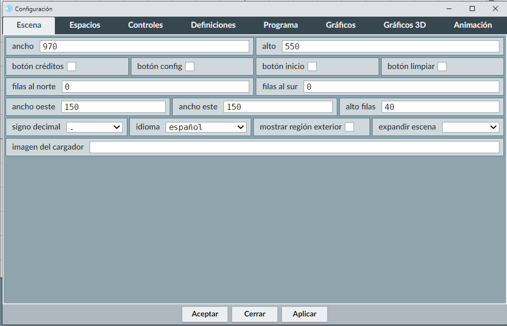 En la parte inferior del editor de escenas, siempre se mostrarán tres botones: Aceptar, Cerrar y Aplicar.