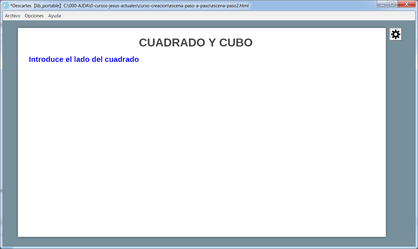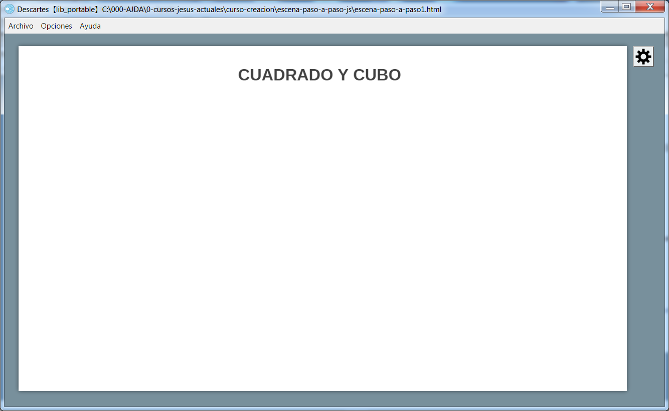 Vamos a realizar el paso 2 de mi primera escena que comenzamos en la práctica anterior. En primer lugar, abrimos la escena con el editor de Descartes, menú archivo/abrir y se selecciona el nombre del fichero, escena-paso1.