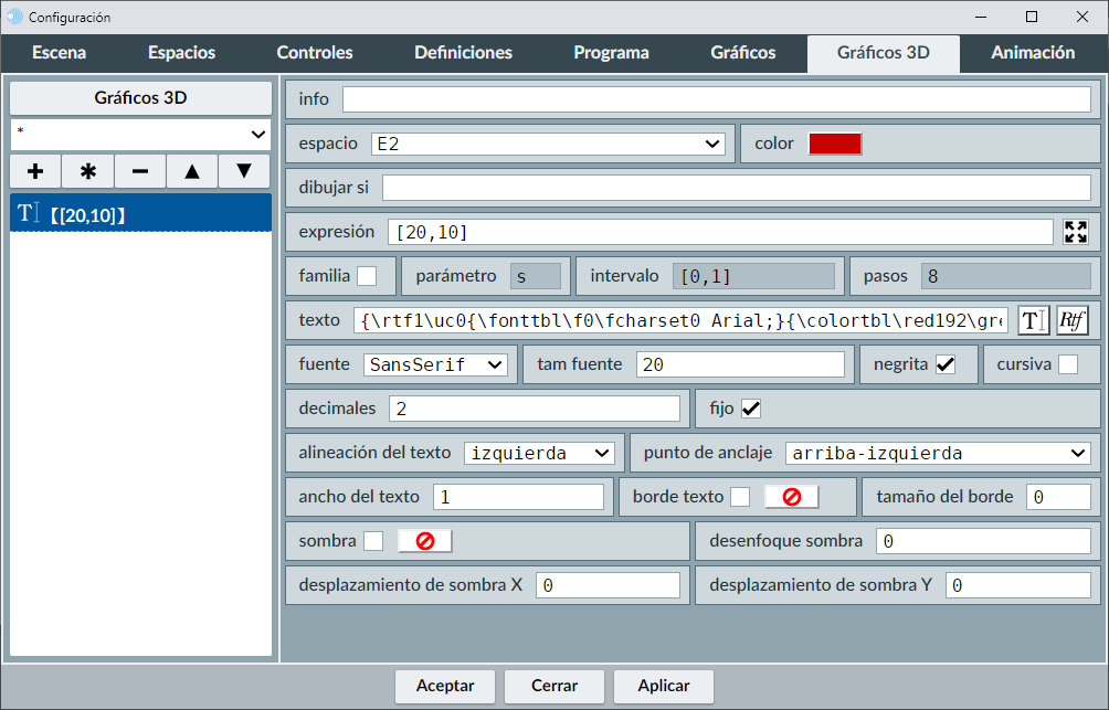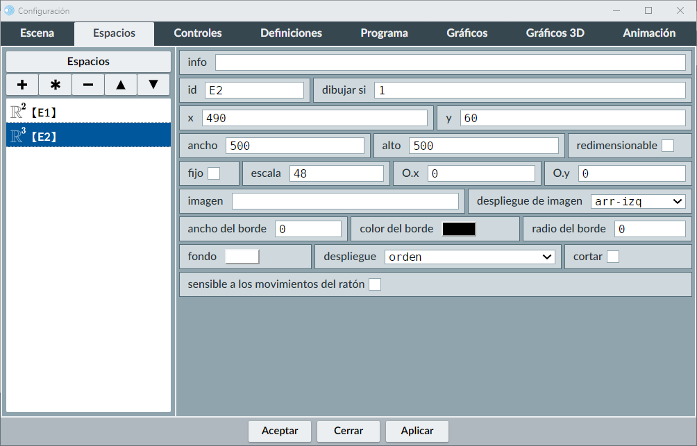 Seguidamente creamos un espacio 3D, a través del menú espacio (botón + agregar espacio R3), con fondo transparente (no se distinguirá por el color del espacio 2D) en la posición 490,40, con un ancho y alto de 500.