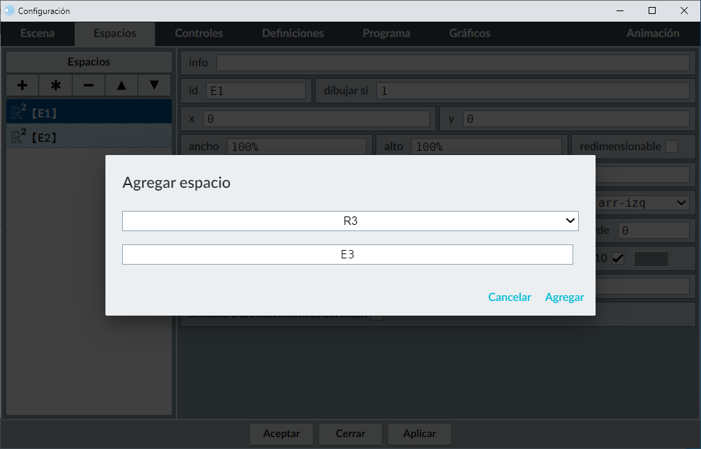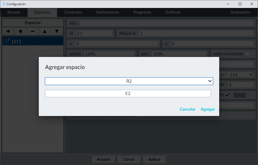 Pulsamos el botón + y se abrirá una ventanita emergente, donde indicaremos el tipo de espacio que queremos introducir (R2: espacio bidimensional, R3: espacio tridimensional; HTMLIFrame: espacio con contenido html). y el nombre que tendrá el espacio en el campo espacio. En nuestro ejemplo seleccionaremos un espacio en dos dimensiones (R2) que tendrá el nombre E2. Pulsamos en el botón aceptar y el nuevo espacio se incluirá en la lista de espacios definidos.