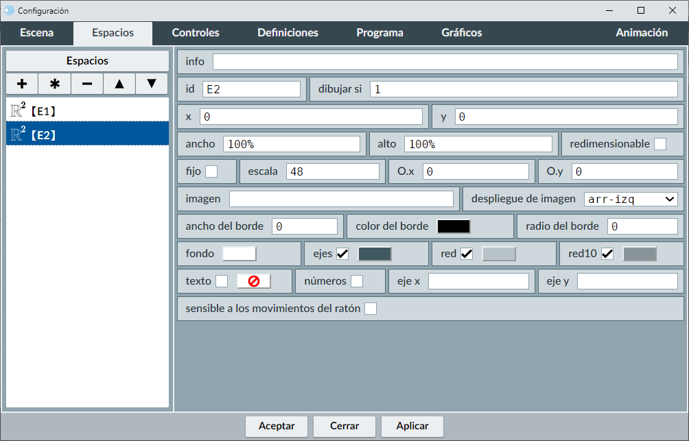 Para poder configurar un espacio lo hacemos a través del panel de configuración de la escena, marcando el control Espacio. Veremos la ventana en la que se definen los parámetros de los espacios de la escena. Como ya hemos dicho, por defecto viene definido un espacio de dos dimensiones llamado E1 (2-D), que tiene activadas los ejes y redes de coordenadas. Podemos trabajar configurando este espacio y/o añadir otros nuevos.