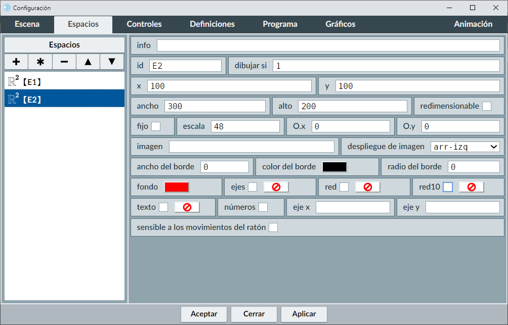 En nuestro ejemplo la esquina superior izquierda de nuestro espacio E2 se colocará en el punto (100,100) de la escena en coordenadas absolutas (a 100 píxeles de alto y a 100 de ancho de la esquina superior izquierda de la escena), su anchura y altura es de (300,200), el color de fondo es rojo, no tiene ni ejes ni rejillas y sin condiciones en dibujar-si. En el editor de configuración se pondrá:
