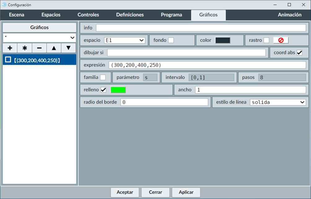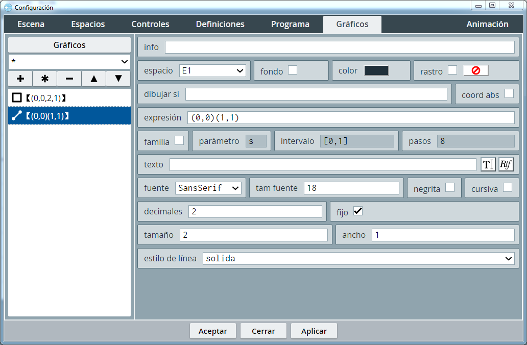 Hay objetos que se definen necesariamente en coordenadas absolutas y otros cuyas coordenadas respecto del espacio en el que se encuentran pueden ser absolutas o relativas, como segmentos, polígonos o flechas. Para los objetos que admiten definirse en los dos tipos de sistemas de referencia, se considerará el sistema absoluto si está señalada la casilla "coord_abs" en la ventana del panel de configuración correspondiente al objeto y relativo en caso de no estar marcado.