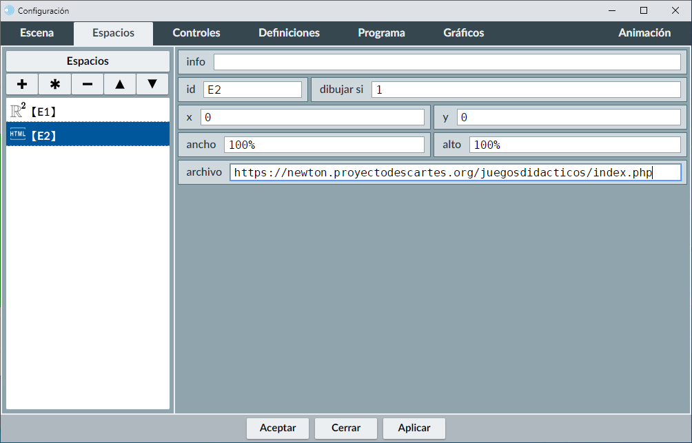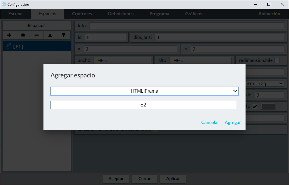 Para introducir un espacio HTMLIFrame, marcamos el campo Espacio del menú superior del panel de configuración de la escena, pulsamos + en el menú izquierdo de espacios y en la ventana emergente seleccionamos HTMLIFrame para introducir un espacio de este tipo y le damos un nombre, por ejemplo, E2 y pulsamos aceptar.