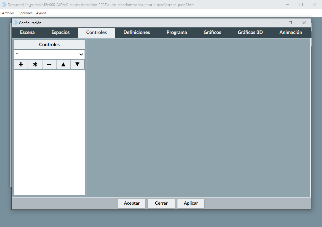 2.1. Pulsar sobre el botón + (- lo borra, * lo duplica y los pulsadores permiten subir o bajar los controles ya creados). El botón Controles permite ver el código de los controles creados.