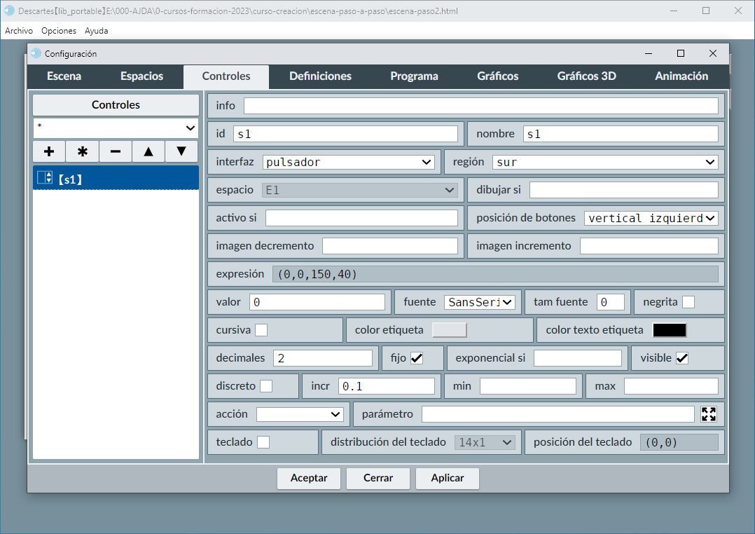 3. Ahora se puede configurar los parámetros del control (espacio, nombre, tipo de control, condición de dibujar, acción, parámetro, etc.).