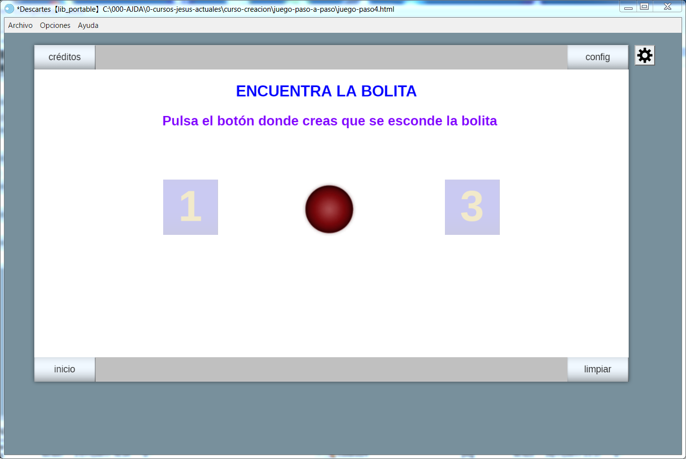 Vamos a realizar el paso 4 del juego. En primer lugar, abrimos el juego con el editor de Descartes, menú archivo/abrir y se selecciona el nombre del fichero, juego-paso3.