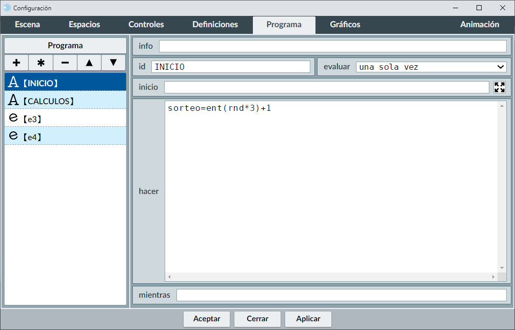 A continuación, crearemos una variable que llamaremos sorteo que tomará aleatoriamente los valores 1, 2 o 3. Para ello definimos en el menú programa y dentro del campo hacer la siguiente línea: sorteo=ent(rnd*3)+1.