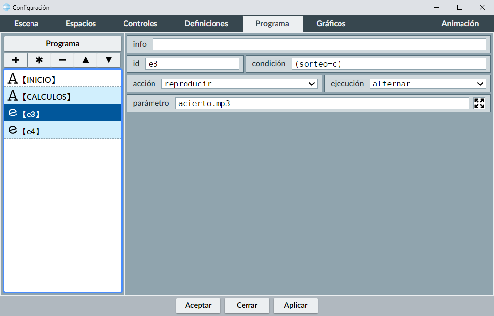 Ahora introduciremos los efectos sonoros, mediante un fichero de sonido para el acierto y otro para el fallo. Estos ficheros, al igual que las imágenes deben de colocarse junto al fichero de la escena. Ahora creamos un evento a través del menú programa (botón + agregar evento) cuya condición será (sorteo=c) y cuya acción será reproducir el sonido del fichero acierto.mp3.