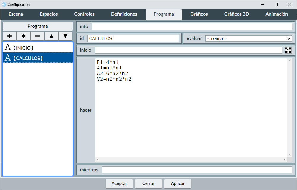 A continuación, vamos a añadir en el menú programa en su algoritmo cálculos las fórmulas del perímetro (P1= 4*n1) y área del cuadrado (A1= n1*n1) y del área (A2= 6*n2*n2) y volumen del cubo (V2= n2*n2*n2). Con ello, en cualquier momento tendremos el valor P1, A1, A2 y V2 al cambiar el valor del lado mediante los controles.