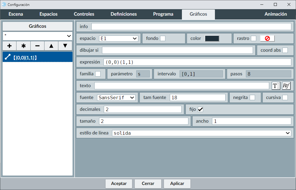 A la izquierda aparece la lista de todos los gráficos de la escena (menú de selección de gráficos). A la derecha veremos un panel (que será diferente para cada tipo de gráfico) en el que se pueden editar todos los parámetros que definen al objeto gráfico seleccionado en la lista.