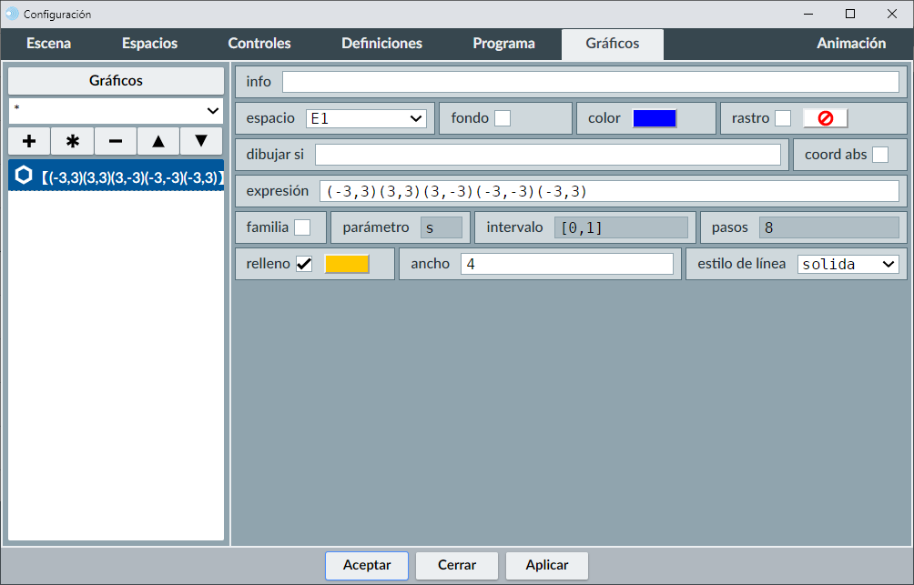 En segmentos, poligonales, arcos, curvas y ecuaciones: Es el ancho o grueso del trazo en pixeles. El valor por defecto es 1. Se recomienda utilizar poco los anchos diferentes de 1 pues ralentizan el dibujo. |