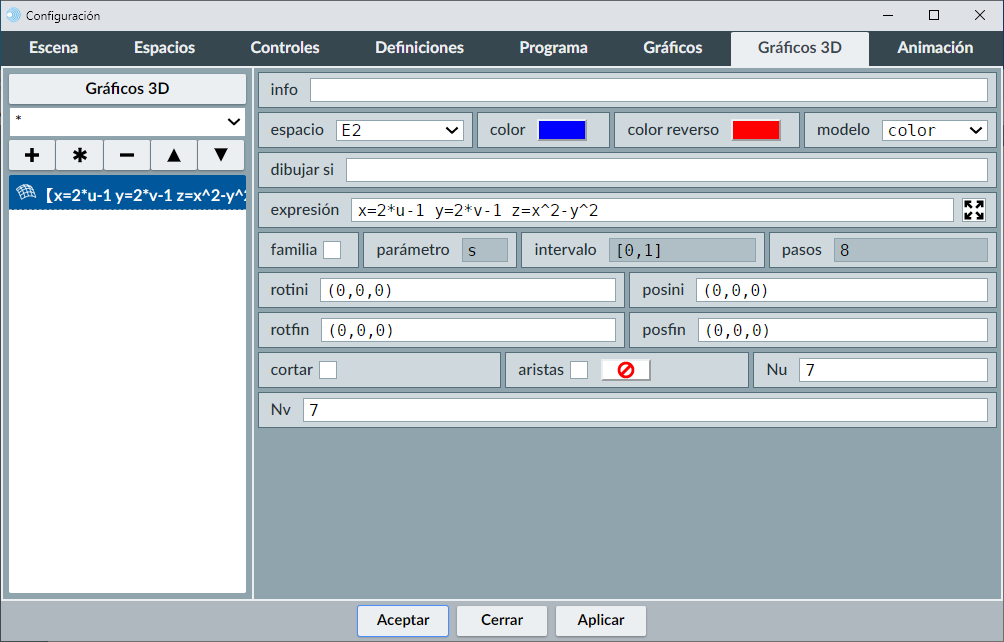 Es necesario llenar el campo expresión del gráfico con una expresión para x (en función de u y v), una para y, y una para z separadas por espacios. |