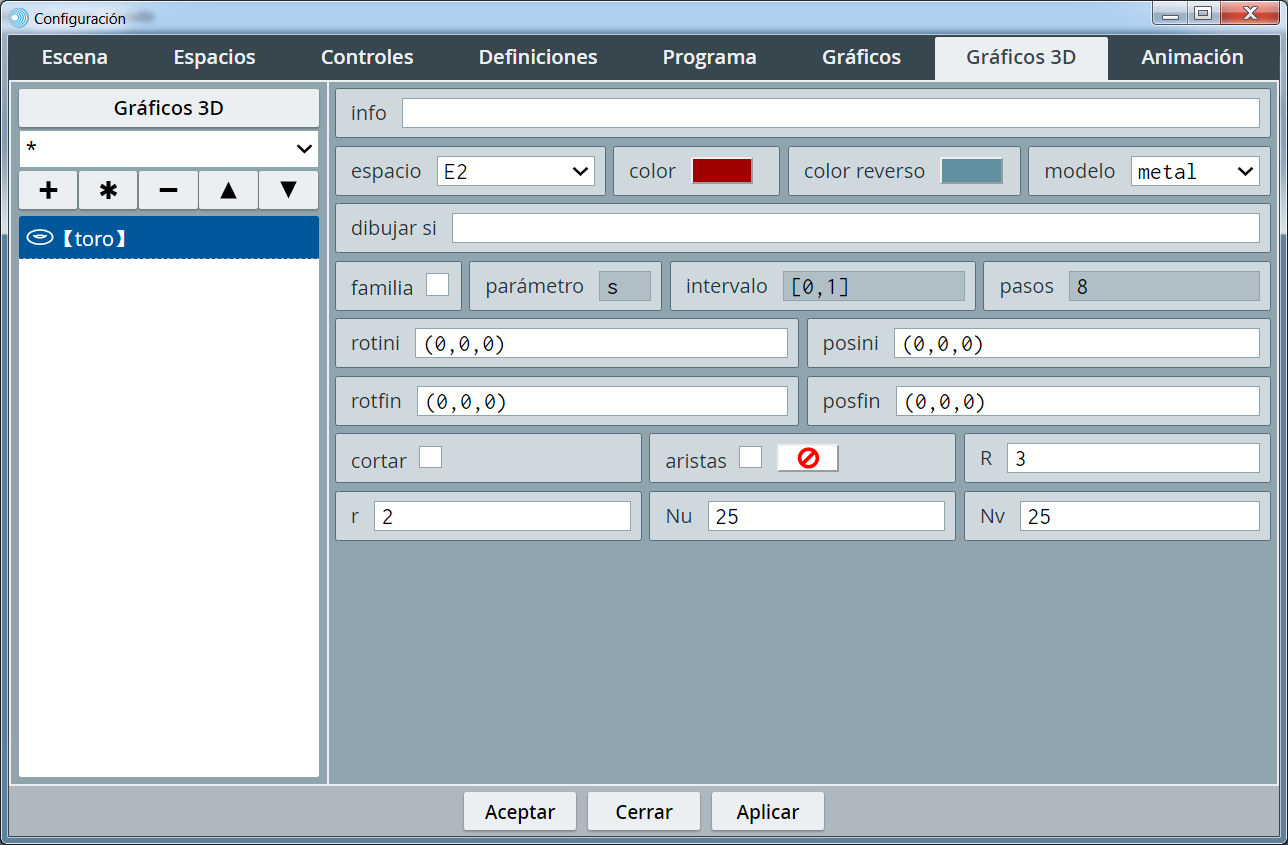 El panel de configuración de una figura geométrica, por ejemplo, de un toro, se muestra a continuación.