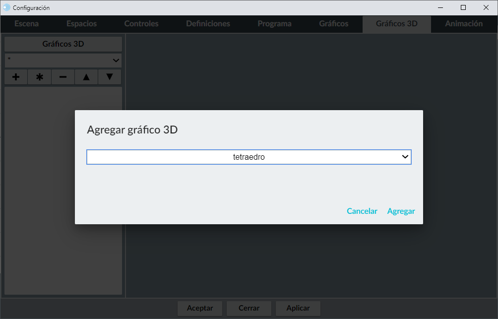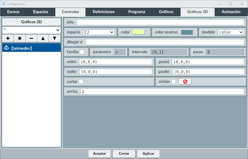 2.1. Pulsar sobre el botón + para añadir un nuevo elemento (- borra el elemento seleccionado, * lo duplica y el pulsador lo puede subir o bajar por la lista). El botón Gráficos 3D, permite ver el código de estos elementos.