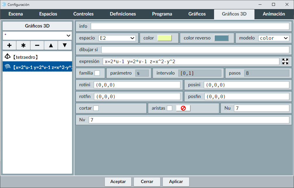 Los paneles de configuración de los distintos tipos de gráficos 3D se parecen mucho entre sí pues tienen varios campos comunes. La imagen muestra el panel de configuración de una superficie. Los campos de las primeras tres líneas más el color los comparten todos los gráficos 3-D, excepto los textos que, en lugar de rotini y posini, tienen texto. La tercera línea la tienen todos los gráficos bidimensionales como caras, poliregs y superficies. La última línea sólo aparece en superficies, polireg, curvas y algunos gráficos especiales como esfera y cono. En el caso de poliregs y curvas sólo aparece Nu.