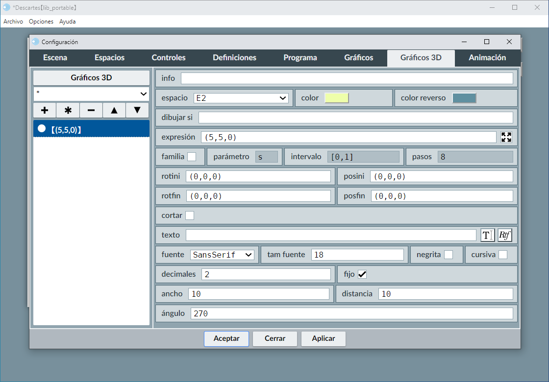 Es una etiqueta que acompaña al punto gráfico y se escribe cerca de él, a su derecha. Por defecto los textos se dibujan en el mismo color que el objeto gráfico y con fuente monoespaciada, pero pueden tener varias líneas, fuentes y colores y pueden incluir fórmulas y valores numéricos variables. Si se quiere utilizar estas opciones hay que pulsar el botón texto para abrir el editor de textos. El valor por defecto es vacío.