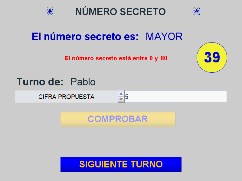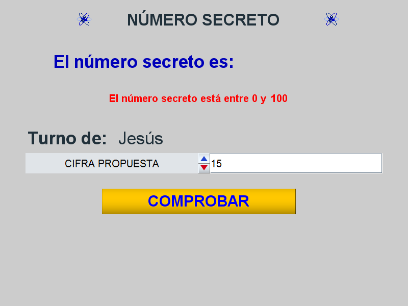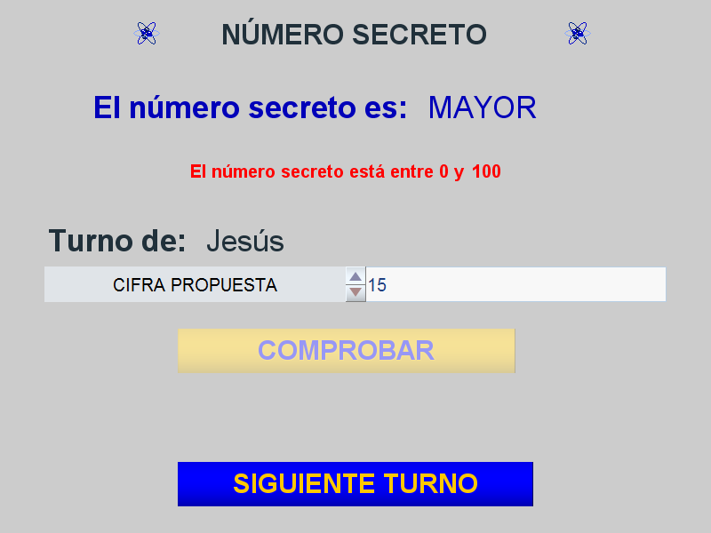 Desarrollo temporal: inicialmente se introduce el nombre de los jugadores y la cifra tope hasta la que puede llegar el número secreto, después estos participan por turnos, en cada turno el jugador da una cifra y verifica si esta es correcta. Si lo es gana el juego y éste finaliza, en caso contrario se mostrará en pantalla una pista sobre si la cifra introducida es mayor o menor que el número secreto y seguidamente, pasará el turno al siguiente participante y así sucesivamente hasta que algún concursante acierte el número secreto y gane la partida.