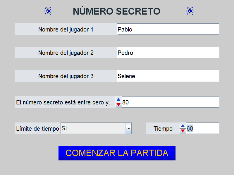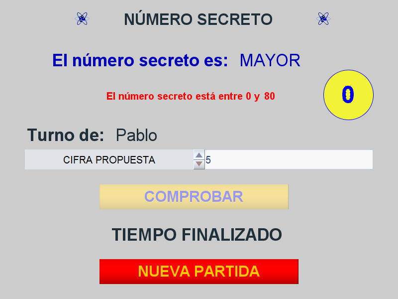 - Estudiar la posibilidad de realizar una variante del juego. Vamos a introducir la posibilidad de que haya un tiempo límite, configurable como parámetro inicial, para encontrar el número secreto. Si ningún jugador encuentra el número en el tiempo establecido la partida finaliza sin ganador. Esto implica la introducción de nuevos controles, uno tipo menú, nuevos gráficos, elementos de programación y la necesidad de que la escena esté animada. Mostramos a continuación el menú de animación y diversas imágenes del desarrollo del juego: