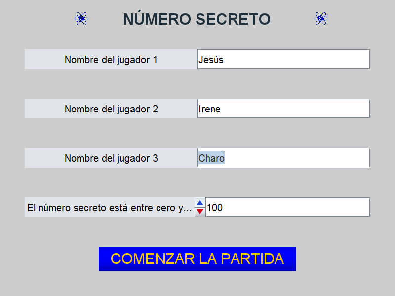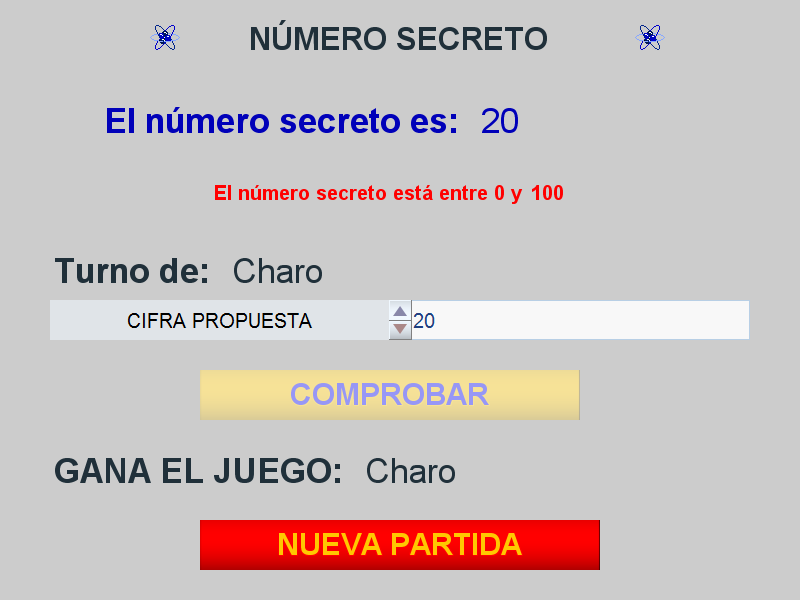 Elementos necesarios: un espacio 2D, (sin ejes ni números), textos (título del juego, nombre de los jugadores, número secreto, pistas, ganador...), controles numéricos tipo pulsador, botón y campo de texto (para introducir el nombre de los jugadores, el número secreto, botones de comienzo, comprobación, siguiente, inicio...), operaciones de cálculo, comparación y condicionales (obtención del número secreto, comparación de cifras, control de turnos...), elementos de reproducción de sonido, imágenes para adornar el juego...