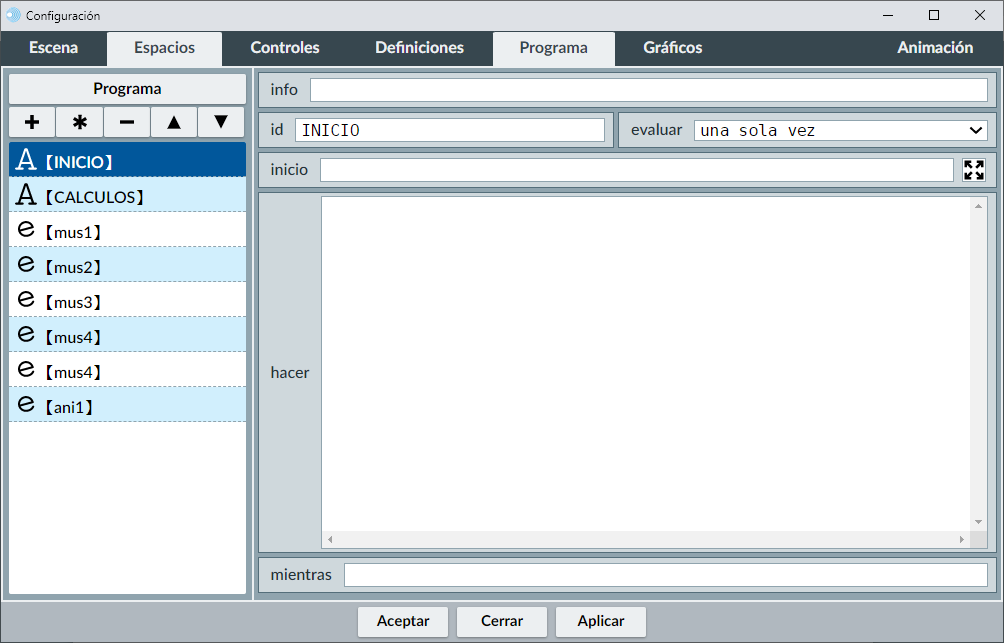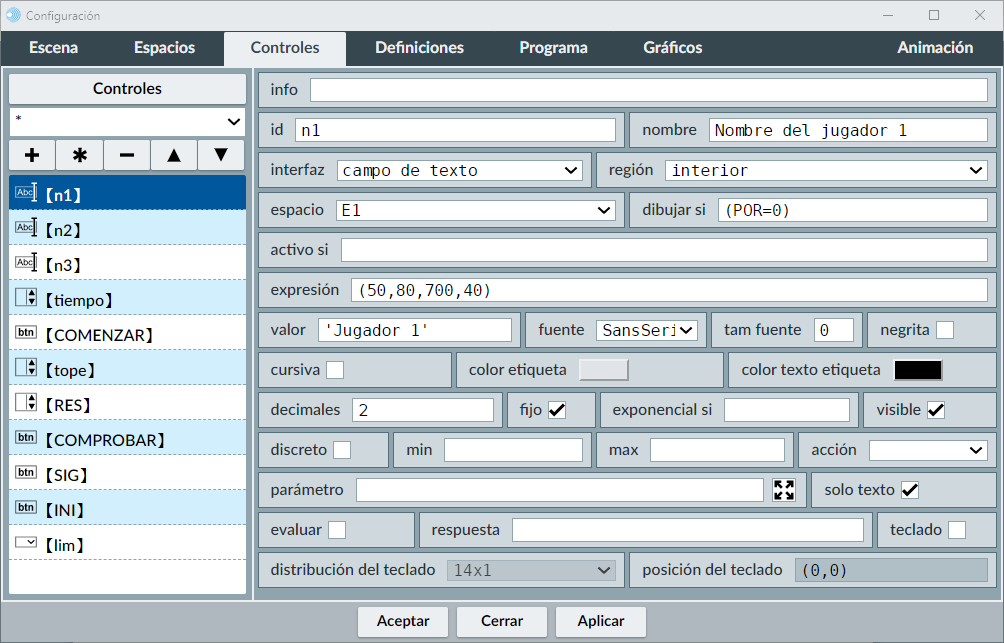 Elaboración del juego en el editor de escenas. Introducimos el espacio, controles, gráficos y elementos de programación (definiciones y programa).