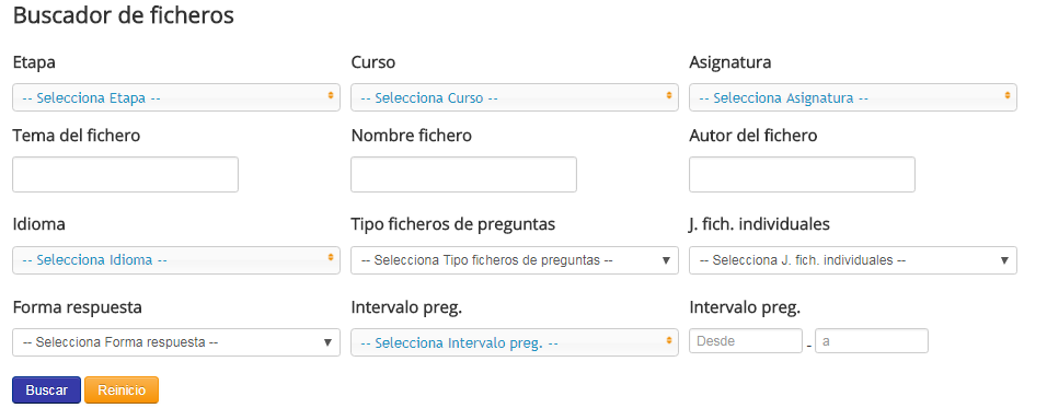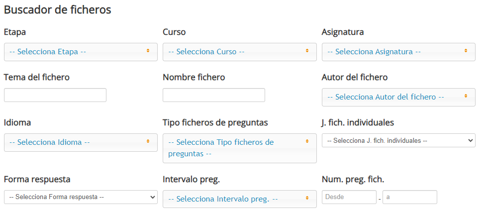 El buscador de ficheros permite seleccionar y buscar ficheros que cumplan con las características pedidas en sus campos de búsqueda. Se accede a través de los enlaces que hay en los submenús desplegables del menú superior: "Buscadores" o "Ficheros de preguntas".