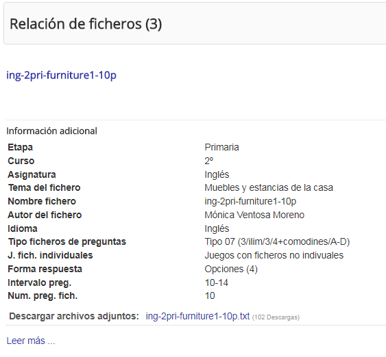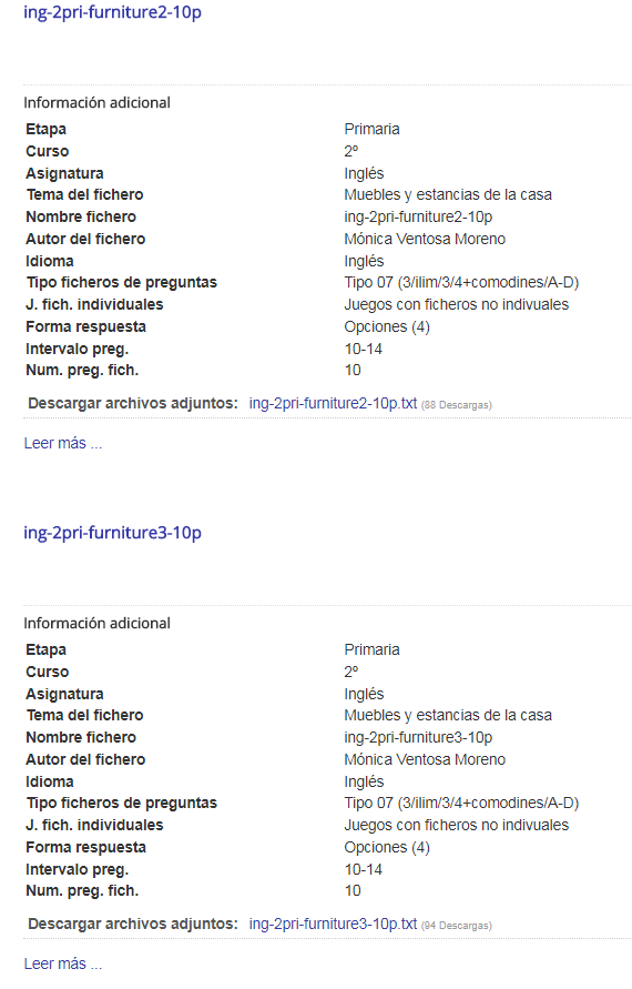 Tras pulsar el botón "Buscar" se muestran los resultados de la búsqueda. En nuestro ejemplo los ficheros que cumplen estas condiciones son: "ing-2pri-furniture1-10p", "ing-2pri-furniture2-10p" y "ing-2pri-furniture3-10p".