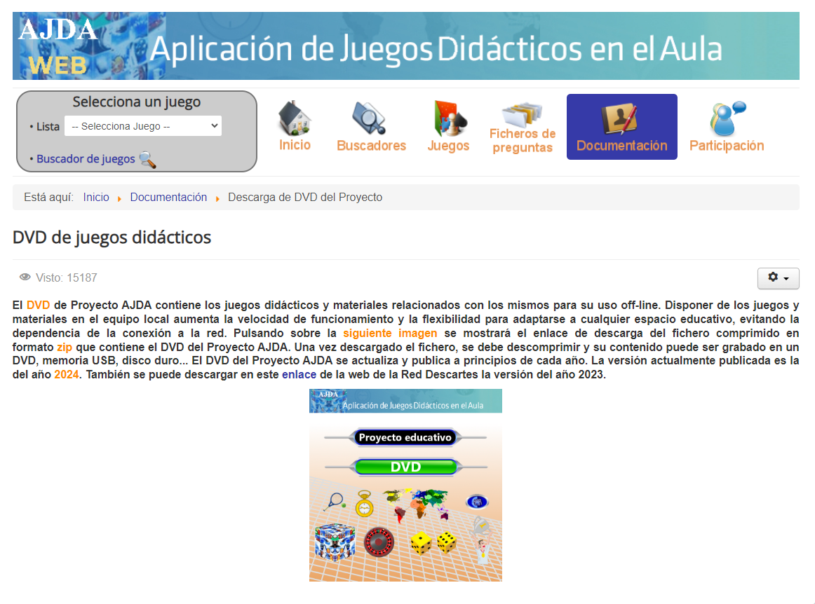- Acceso a la descarga del DVD del Proyecto. permite descargar de forma comprimida el DVD del Proyecto desde la web de ADJA y también existe un enlace para poder obtenerlo desde la web de la Red Descartes.