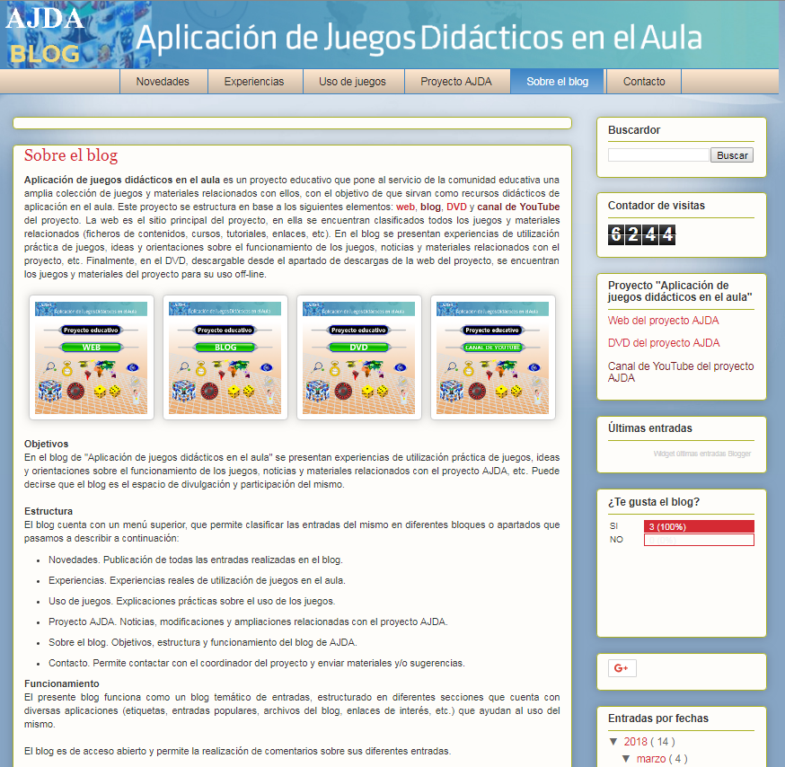 El blog del Proyecto AJDA es el espacio de divulgación y participación del mismo. En él se presentan artículos sobre experiencias educativas con juegos, uso de estos recursos, gamificación, publicaciones relacionadas con AJDA, participación de usuarios, etc. Para acceder al blog se puede hacer pulsando sobre la siguiente imagen, clicando sobre el siguiente enlace o escribiendo la siguiente dirección en el navegador: http://aplicacionjuegos.blogspot.com.es/