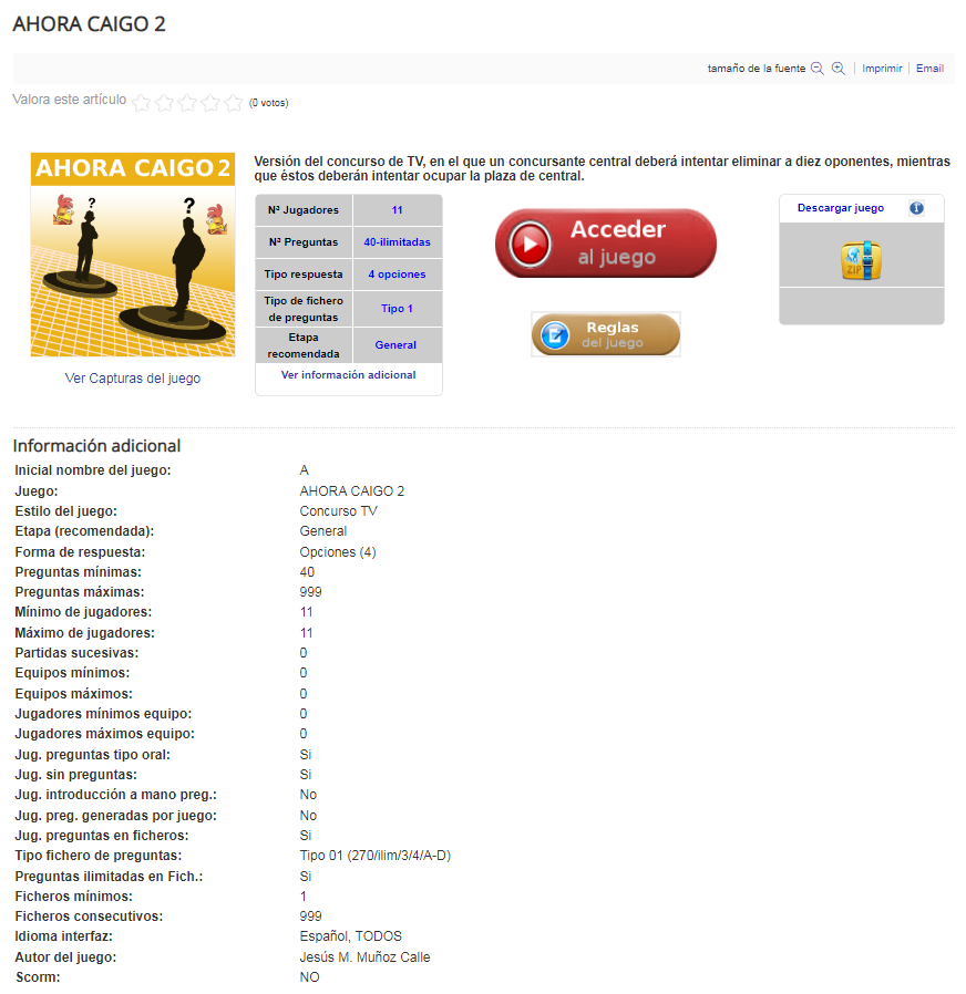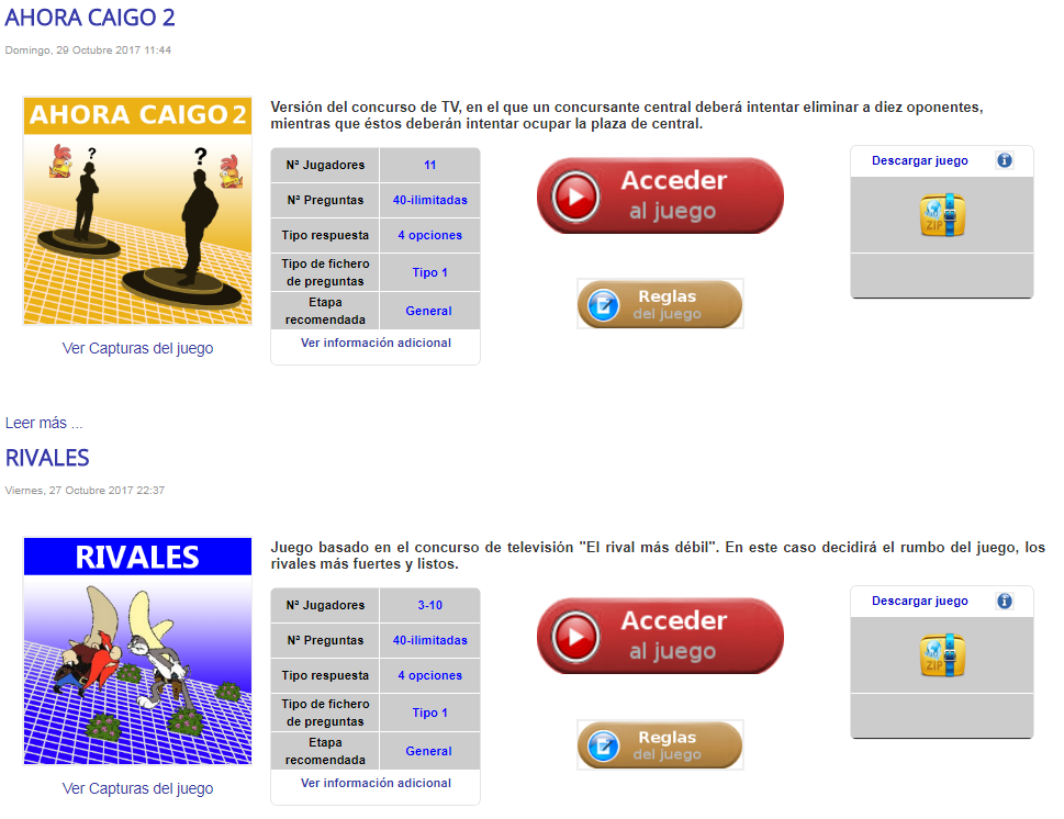 Descarga del juego. Permite descargar el juego en formato zip y para parte de los juegos en formato SCORMS (para poder utilizar estos juegos en plataformas LMS como Moodle).