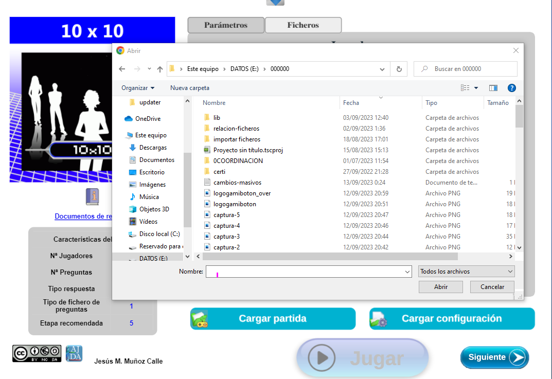 - Al pulsar el botón Cargar partida se abrirá una ventana de exploración de archivos que permitirá buscar y seleccionar el fichero de continuación de una partida anteriormente guardada.