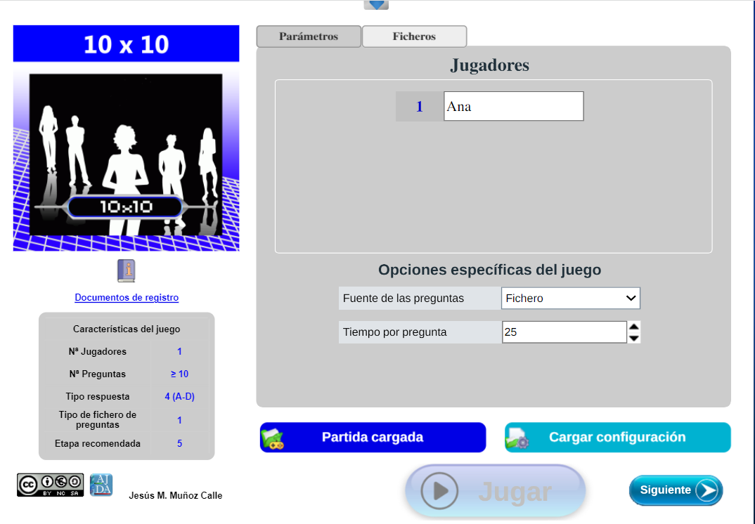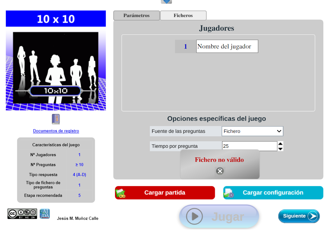 - Si el fichero cargado es correcto dicho control tomará un color azul oscuro y se podrá ver que se han cargado los datos de configuración de la partida seleccionada. Tras cargarse la partida, los datos de configuración pueden ser modificados si se desea.