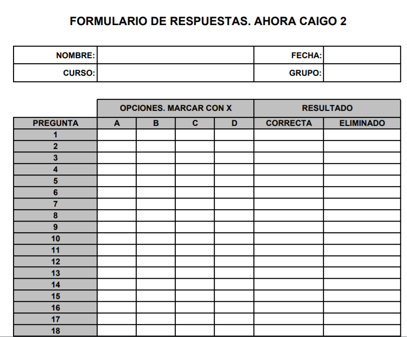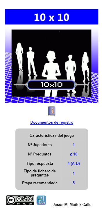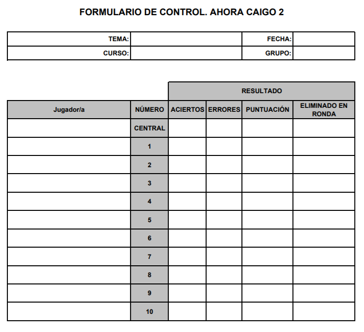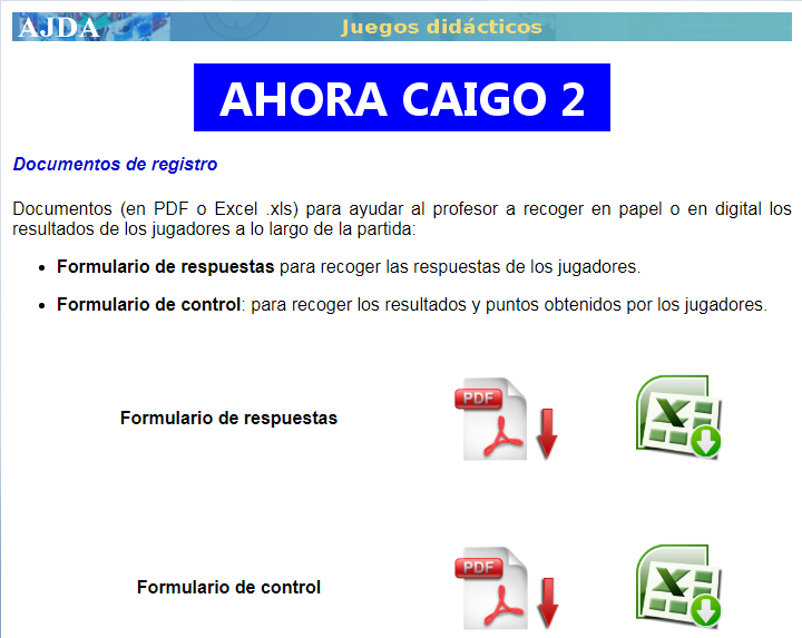 | En cada juego se han incluido documentos de respuesta y control en formato xls y pdf. Su uso es opcional y supeditado a la dinámica que se desee seguir al utilizar los juegos. Los formularios de respuestas se pueden utilizar para que los concursantes reflejen por escrito sus respuestas en los mismos. Los formularios de control permiten al profesor o presentador del juego a recoger por escrito los resultados obtenidos por los diferentes participantes en el mismo. |