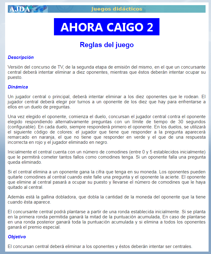 | Al pulsar sobre el "librito" se muestran las reglas del juego mediante una ventana emergente. Dicho control reglas del juego también aparece en el menú superior y en las pantallas de selección de juegos de la web de AJDA. Las reglas del juego tienen tres apartados: descripción, dinámica y objetivo del juego. |