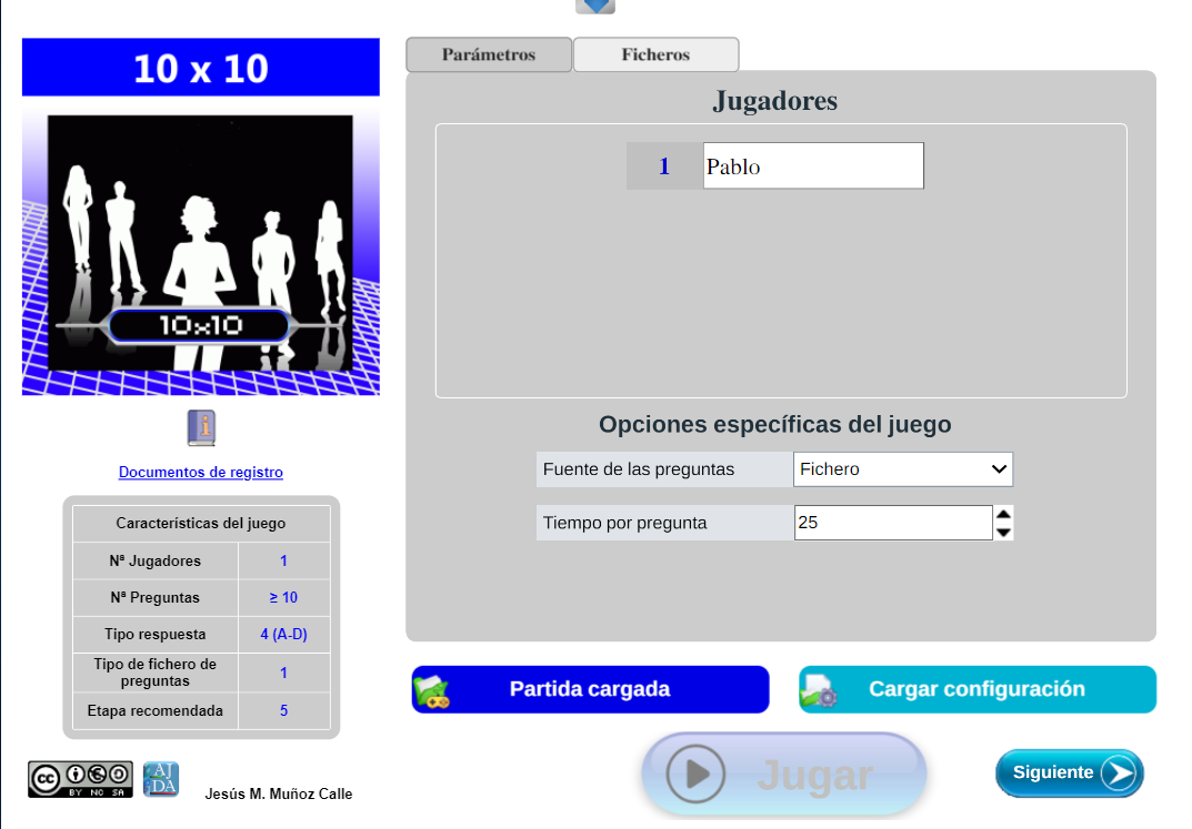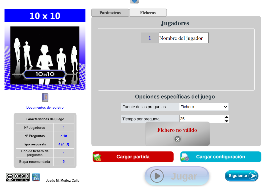 Si la selección es correcta, se cargará el fichero, el control se pondrá en azul oscuro y la partida continuará en el punto indicado por el fichero de continuación, mostrándose los parámetros de configuración cargados. En el caso de que la fuente de preguntas sea mediante ficheros de preguntas, cuando se continúe una partida, se deberá cargar el fichero de preguntas que se desee (la fuente de preguntas no se guarda, se selecciona siempre al principio del juego y se puede cambiar en el transcurso del mismo).