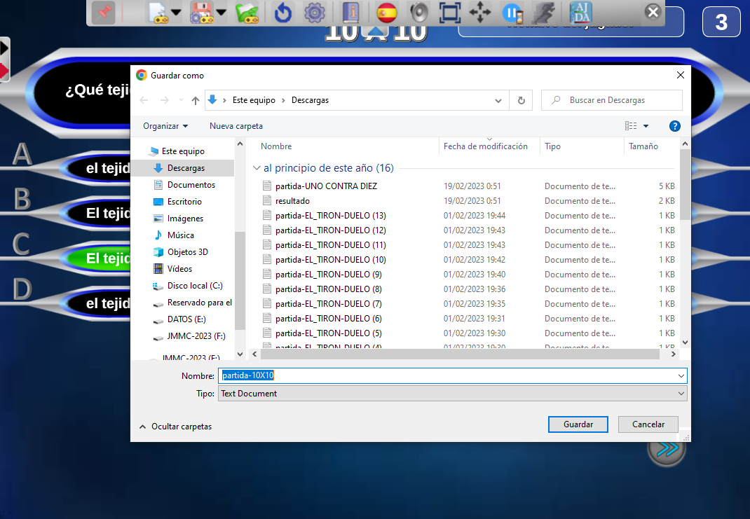 Al pulsar dicho botón, se abrirá una ventana que permitirá seleccionar la ubicación y nombre del fichero que contendrá los datos de la partida que se va a guardar.