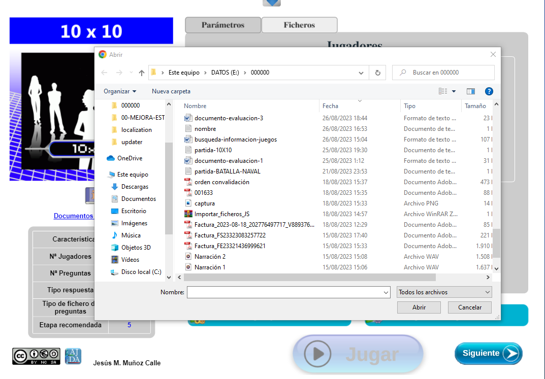 - Al inicio de una partida, mediante el control Cargar partida de la página de configuración (zona 2). Al pulsarlo se abrirá el explorador de ficheros del navegador y se deberá seleccionar el fichero de continuación de partida previamente guardada.