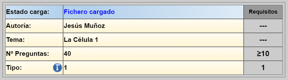 Al cargar un fichero se mostrarán los datos cargados del mismo: estado de carga, autor, tema, número de preguntas y tipo de fichero. En caso de existir algún error se podría detectar en estos datos. Además, a la derecha se muestran los requisitos de número mínimo de preguntas y tipo de fichero. Si todo es correcto, el botón "Jugar" quedará activado.