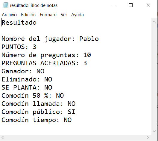 Se recogerán los datos más significativos del juego: nombres de los participantes, aciertos, fallos, puntuaciones, eliminaciones, ganadores, etc. Cada juego reflejará datos específicos del mismo. El fichero guardado es editable y se pueden realizar correcciones o modificaciones si se estiman necesarias.