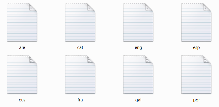 Si abrimos el fichero un fichero de idioma español, esp, encontraremos en el mismo las palabras del idioma en español, si abrimos el fichero eng, las encontraremos en inglés y así para todos los idiomas.