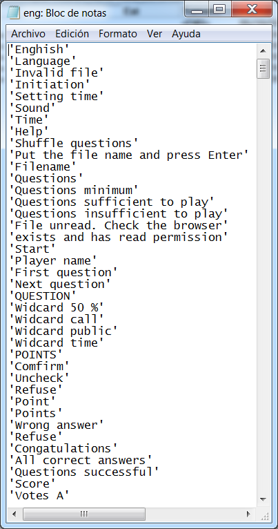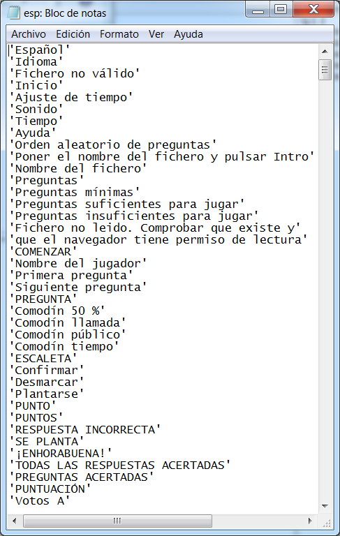 Abrir el fichero copiado, traducir y cambiar las entradas que se deseen. Es muy importante que todas las palabras estén entre comillas simples y que no se altere el número de entradas por línea, ni el orden de las mismas.