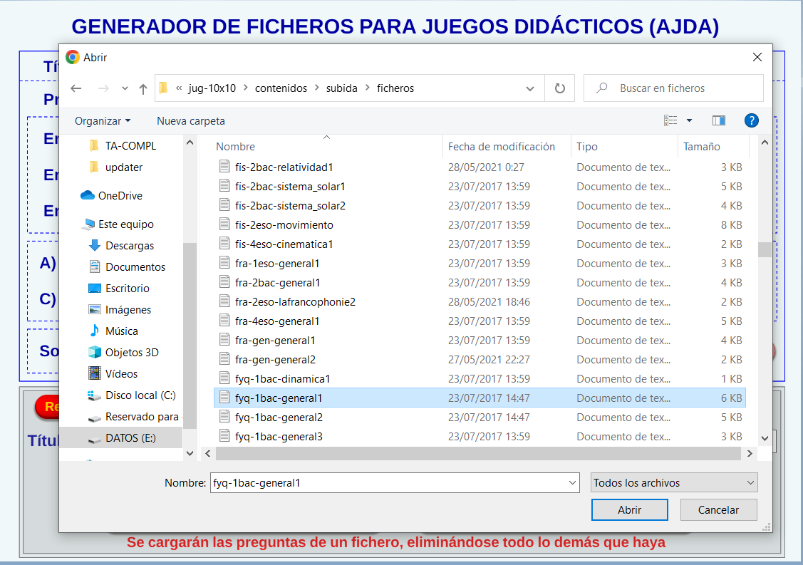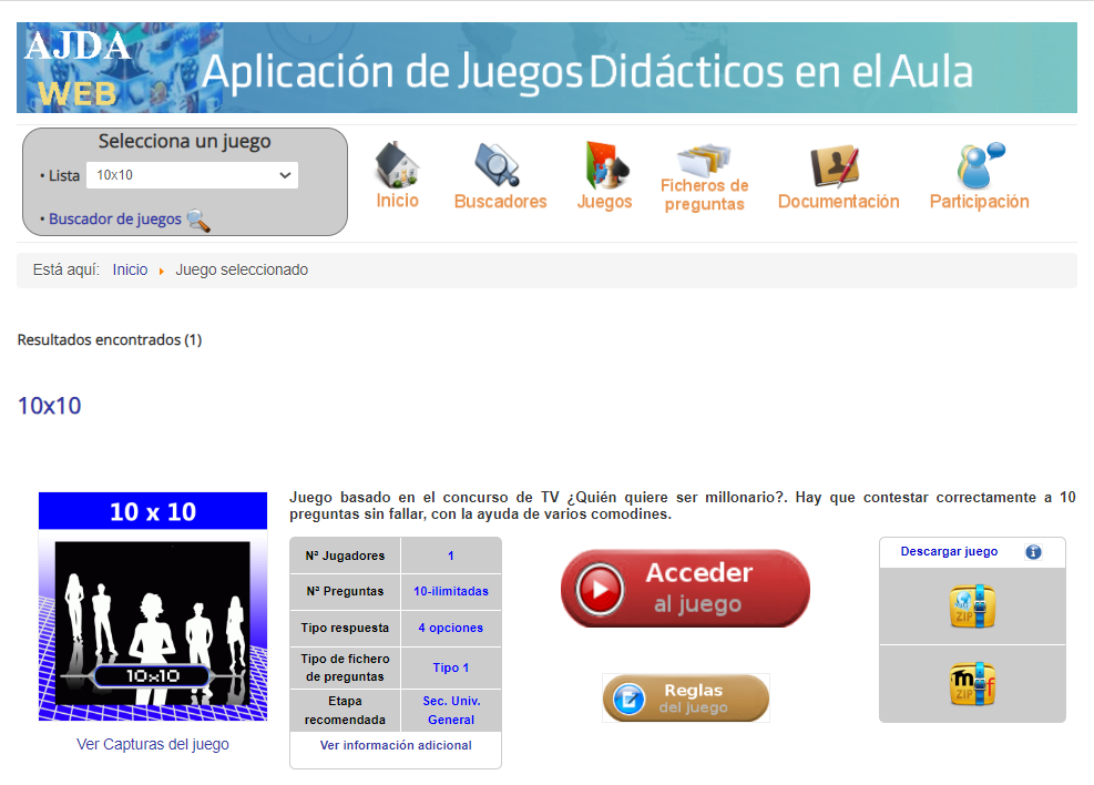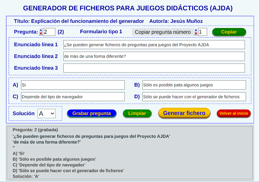 También se pueden utilizar los ficheros de preguntas del repositorio del Proyecto AJDA, se recomienda seleccionarlos con el buscador de ficheros. Una vez seleccionados, descargarlos, modificarlos si se estima necesario y utilizarlos en el juego.