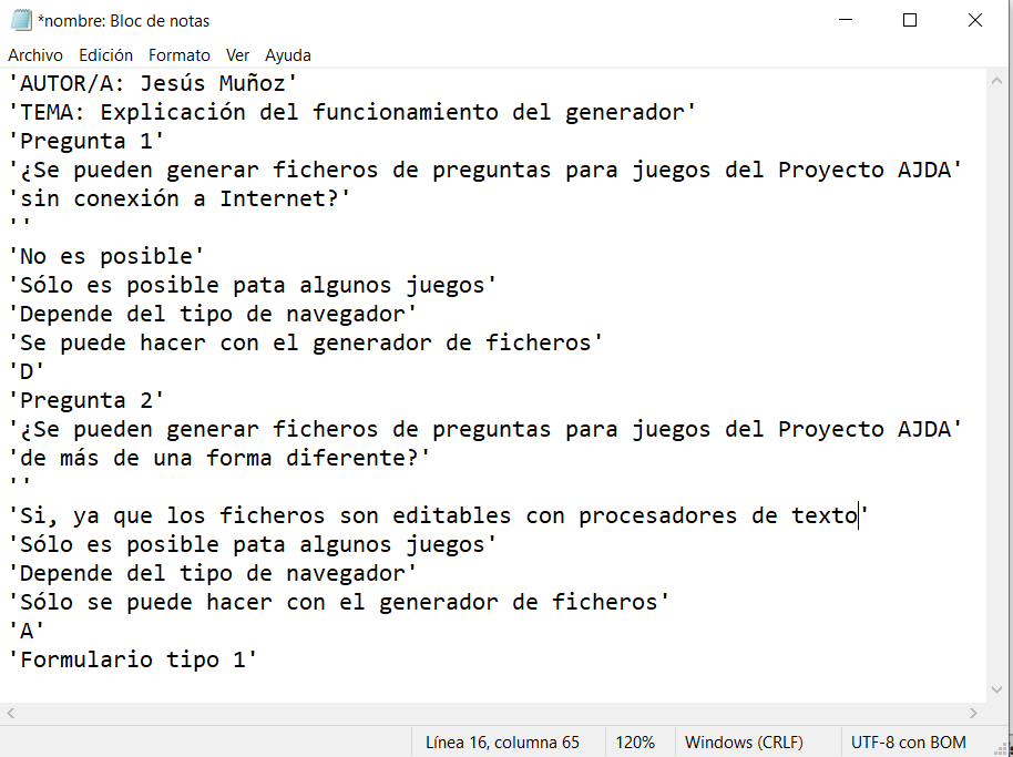 Otra opción para generar los contenidos de los juegos consiste en editar directamente un fichero de texto de contenidos del juego (sin necesidad de usar el generador o los formularios o usándolo simplemente para descargar un fichero con el formato adecuado, pero sin contenidos). Sobre este fichero de texto se pueden escribir los nuevos contenidos, guardando después los cambios con el nombre de fichero que se desee. Esta opción puede ser más directa, pero se debe tener la precaución de respetar el formato de los ficheros y limitarse a introducir contenidos en los mismos, siguiendo las recomendaciones que acabamos de comentar. Esto es especialmente útil cuando queremos hacer un nuevo fichero a partir de uno ya creado cuyas preguntas y respuestas son parecidas.
