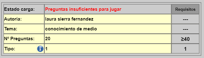 El este otro ejemplo el juego necesita un mínimo de 40 preguntas y el fichero que se ha cargado contiene 30, por tanto, la partida no podrá comenzar hasta que haya un número mínimo de preguntas en el fichero, igual o superior al establecido en los requisitos.