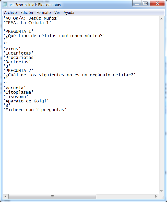 Editar los ficheros de contenidos con un editor de textos (bloc de notas, por ejemplo) y se copian a continuación de la última pregunta (o detrás de la pregunta que se desee), las nuevas preguntas que queramos incluir. Por ejemplo, tenemos el siguiente fichero que contiene dos preguntas: