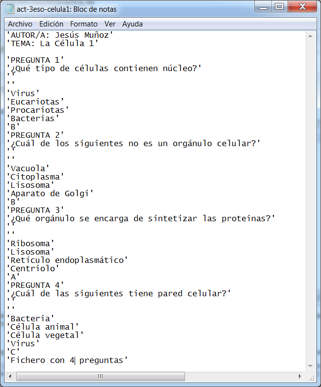 Se pueden copiar o escribir tantas preguntas como se desee, siendo muy importante no borrar ni añadir ninguna línea del fichero (título, autor, línea final del fichero con título del juego...) que no sean preguntas.
