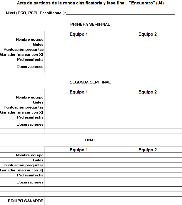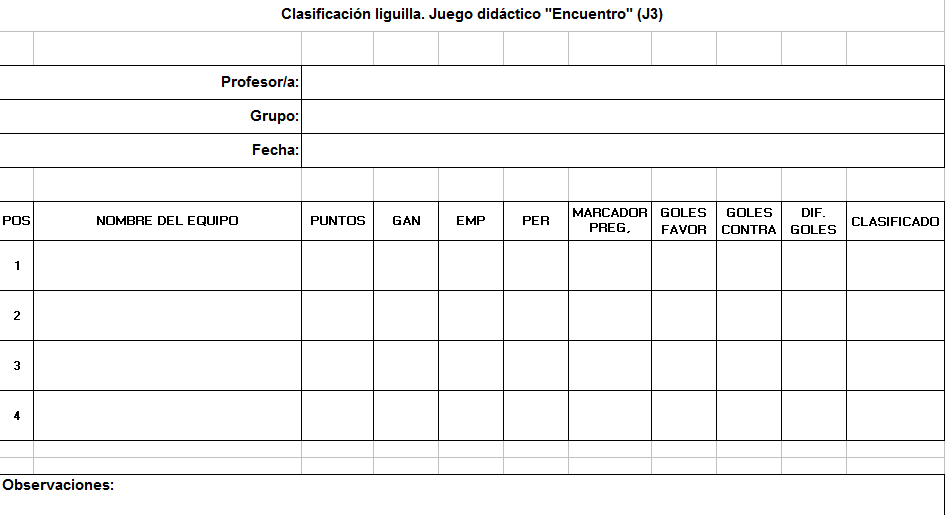 Realización de una hoja de cálculo específica para recoger resultados de marcadores de diferentes actividades, por ejemplo, para realizar una olimpiada. A continuación, se presenta un ejemplo (que se puede descargar del juego "Marcadores").